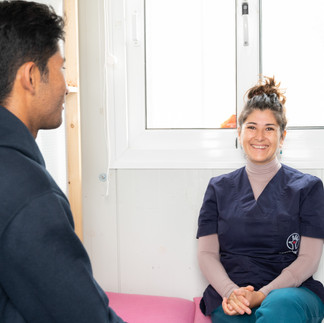 Fabiola und ihr Farsi-Übersetzer, selbst ein Flüchtling im Camp, sind mit Amira, einer jungen afghanischen Frau im Behandlungsraum im Container von Earth Medicine. Im Flüchtlingscamp auf Lesbos. Auf der griechischen Insel, auf der seit 2015 Hundertausende Flüchtlinge über die gefährliche, wenn auch eigentlich kurze Route, über das Meer aus der Türkei gekommen sind. So auch Amira. Und jeder Einzelne im Camp, egal, ob jung oder alt. Egal, ob körperlich fit oder schon vor der Flucht beeinträchtigt.